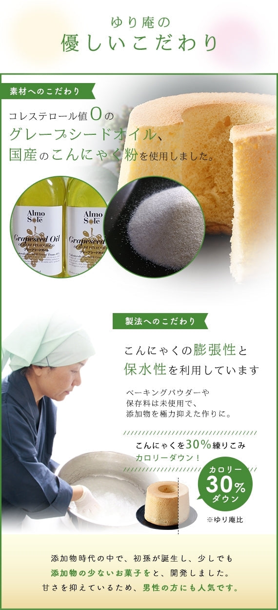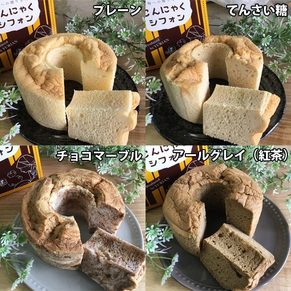 【プレーン】 鶏卵(国産)・小麦粉・砂糖・グレープシードオイル・こんにゃく粉・塩【チョコマーブル】 鶏卵(国産)・小麦粉・砂糖・グレープシードオイル・チョコ・こんにゃく粉・ ココア・塩 【てんさい糖】 鶏卵(国産)・小麦粉・てんさい糖・グレープシードオイル・こんにゃく粉・塩【アールグレイ紅茶】 鶏卵(国産)・小麦粉・砂糖・グレープシードオイル・こんにゃく粉・アールグレイ紅茶・塩*原料製造工場では、小麦・乳・卵・ピーナッツ・そばを含む製品を製造しています