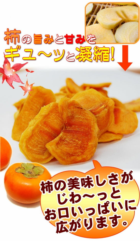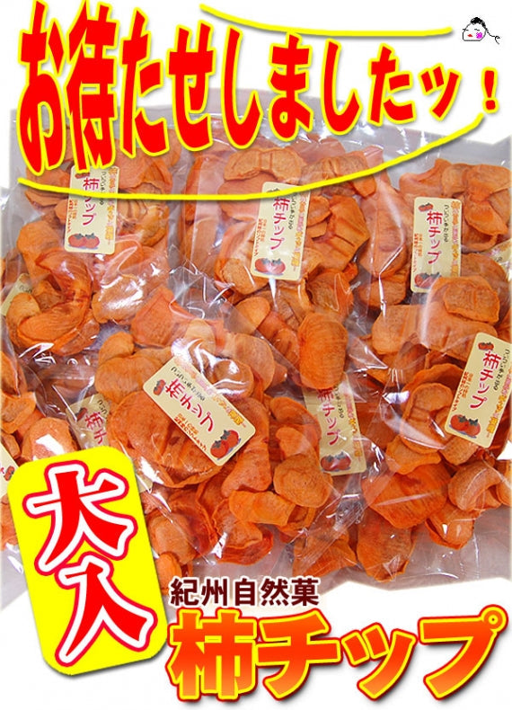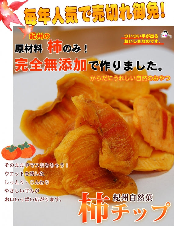紀州産の柿だけを使用し、無添加で作りあげた自然の美味しさが凝縮した柿チップ。 柿チップの原材料は柿のみです。 柿以外のお砂糖や添加物は一切使っておりません。 でも、驚くような自然の甘みと美味しさは、ウエット感を残した仕上がりで、噛むほどに柿の美味しさがお口に広がり、後味も大変上品で、柿本来の甘味がお口に残ります。 柿は他の果物に類を見ないほど、多くのビタミンをバランスよく含む果物です。 昔から「柿が赤くなると、医者が青くなる」と言われるほど。 そして、生のままよりも、柿チップにすると、その成分は約4倍にもなると言われる、体にやさしい、紀州の自然菓(自然のお菓子)です。 ※製品の黒い部分は、柿しぶタンニンでビタミンC・P・E等の貴重な成分が含まれています。