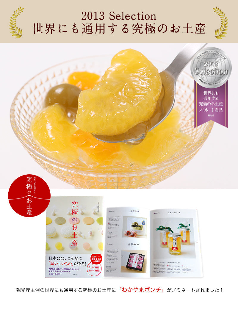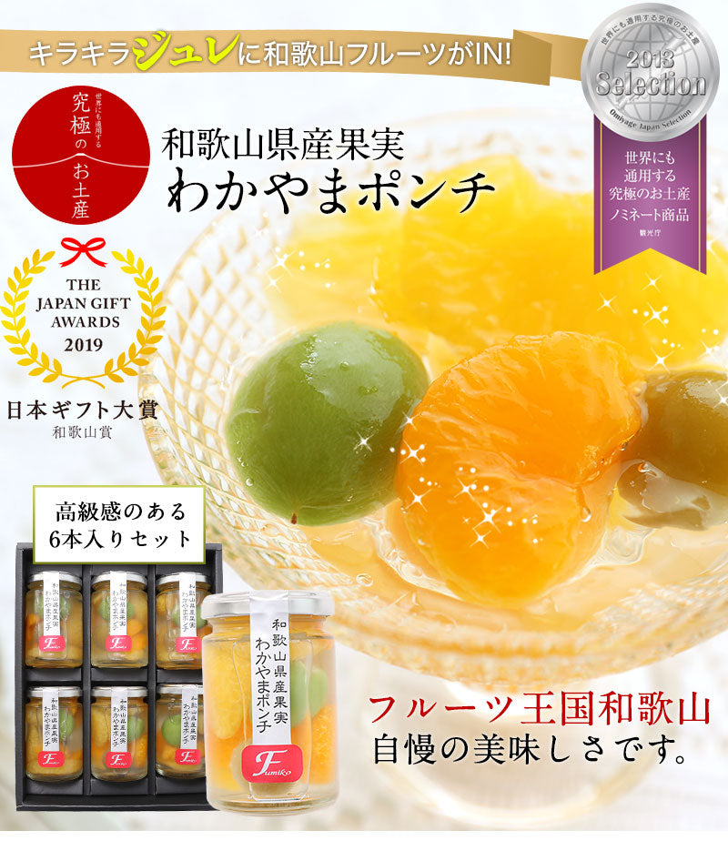 和歌山県産の梅の甘露煮、温州みかん、八朔(ハッサク)と、種が出来る前の「あら川の桃」の若桃をジュレにそっと閉じ込めました。 フルーツ王国、和歌山ならではの、やさしい甘みとフルーツ本来の香りをご自宅で、冷たく冷やしてご賞味くださいませ。和歌山県は梅、みかんをはじめとして全国的に生産量がトップクラスの果物がいくつもあります。 このことを広くPRするために県食品流通課が梅と果物を使ったフルーツポンチを和歌山名物にしようとしたのが始まりです。そして今回、ふみこ農園で初めて和歌山県との連携により、全国に向けて展開させて頂ける、わかやまポンチが出来上がりました!