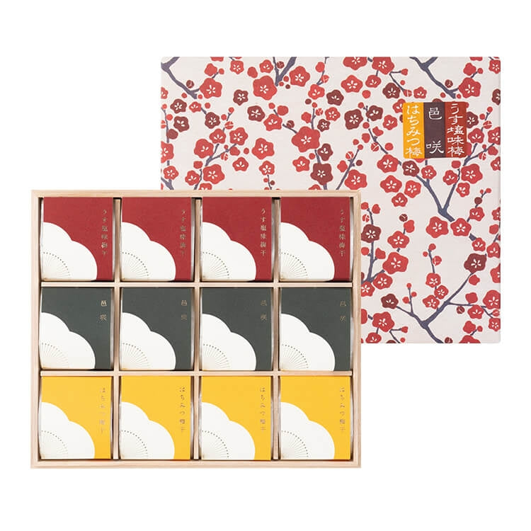 うす塩味梅干●原材料名:梅、漬け原材料名〔糖類(砂糖、果糖ぶどう糖液糖)、食塩、みりん、醸造酢、はちみつ〕 酒精、調味料(アミノ酸等)、V.B1、酸味料、野菜色素●原料原産地名:紀州産●塩分:約8%●保存方法:直射日光を避け、常温で保存してください。 邑咲(むらさき)●原材料名:梅、漬け原材料名[食塩、糖類(砂糖、果糖ぶどう糖液糖、麦芽糖)、米酢、醤油、味醂、昆布エキス]、酸味料、(原材料の一部に小麦、大豆を含む。)●原料原産地名:紀州産 ●塩分:約8%●保存方法:直射日光を避け、常温で保存してください。 はちみつ梅干●原材料名:梅、漬け原材料[還元水飴、食塩、醸造酢、発酵調味料、はちみつ]酸味料、酒精、調味料(アミノ酸等)、V.B1、ユッカ抽出物、甘味料(ステビア、スクラロース)●原料原産地名:紀州産●塩分:約5%●保存方法:直射日光を避け、常温で保存してください。