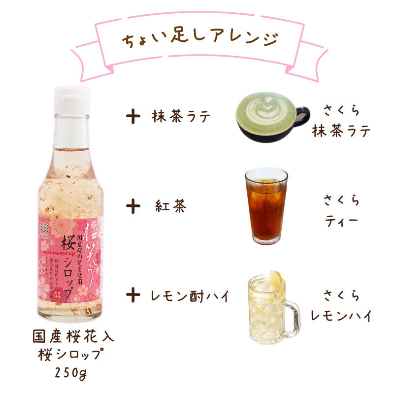 天然の桜のシロップでかき氷がカフェ風に!くずもち・ゼリー・アイスも和の華やかさ!炭酸水やお酒と割って和ドリンク。カフェ風サクララテも。