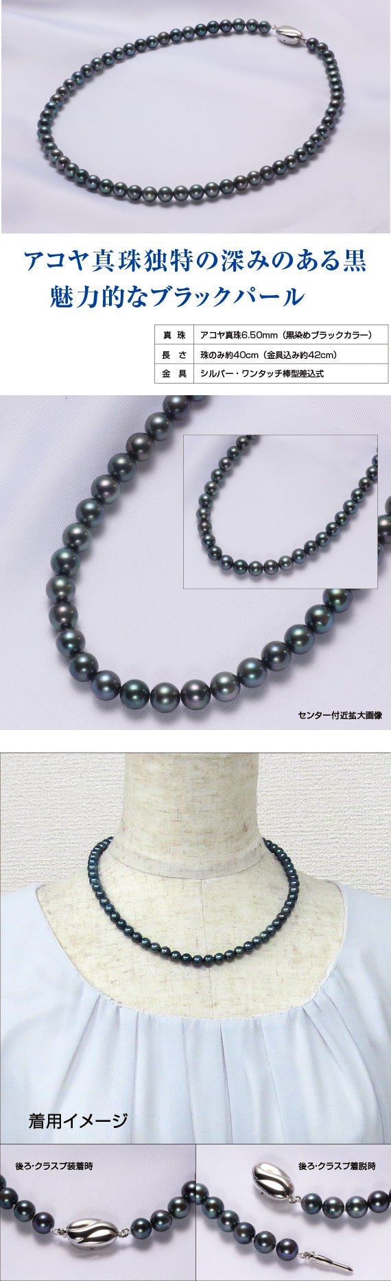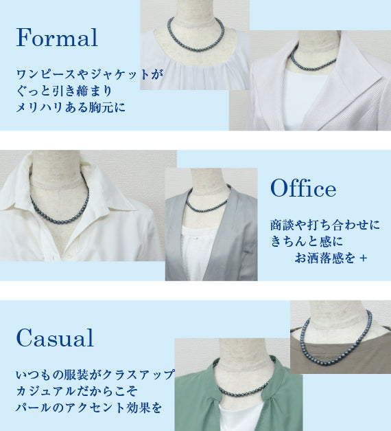 華やかで上品、シックでノーブル、ブラックカラーの真珠ならでは肌とのコントラストが目に留まります