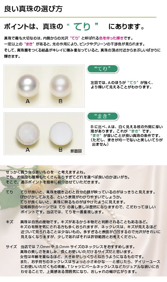 私たちは、真珠についてきちんとした知識・お手入れ方法をお客様に知っていただき、真珠の輝きを、永く、美しく保ち、愛着を持ってお使いただけるようにサポートいたします。