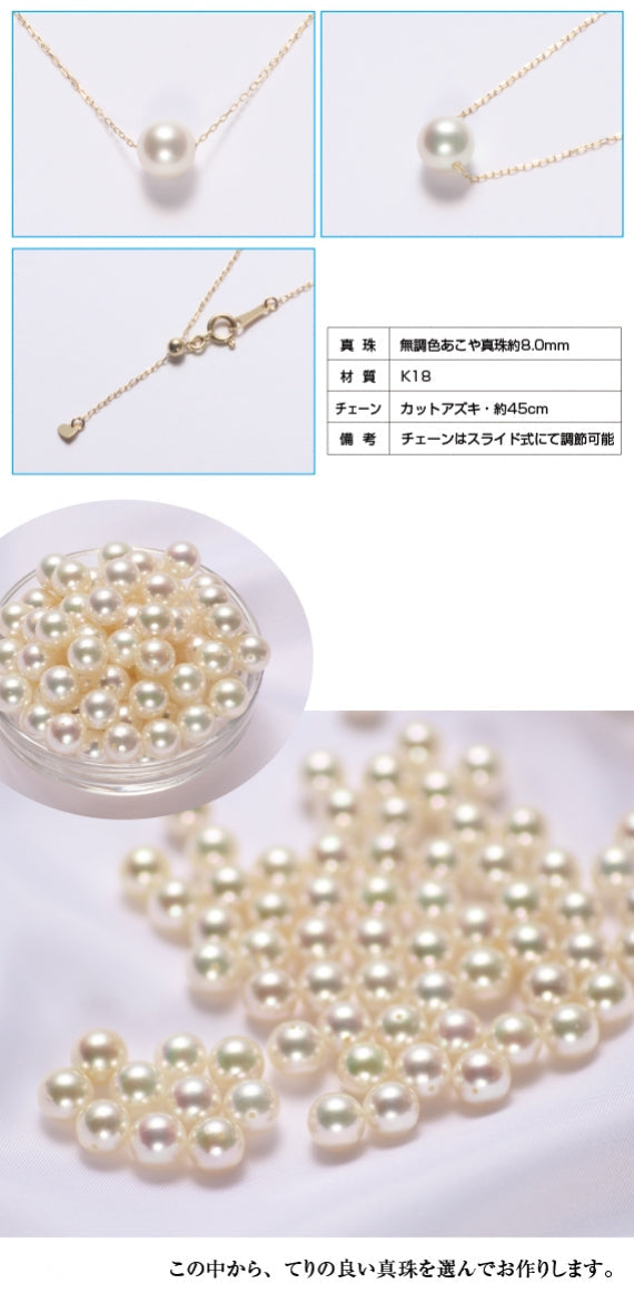 アコヤ真珠特有のシワやキズは少しありますが、てりの良いものを選びました。