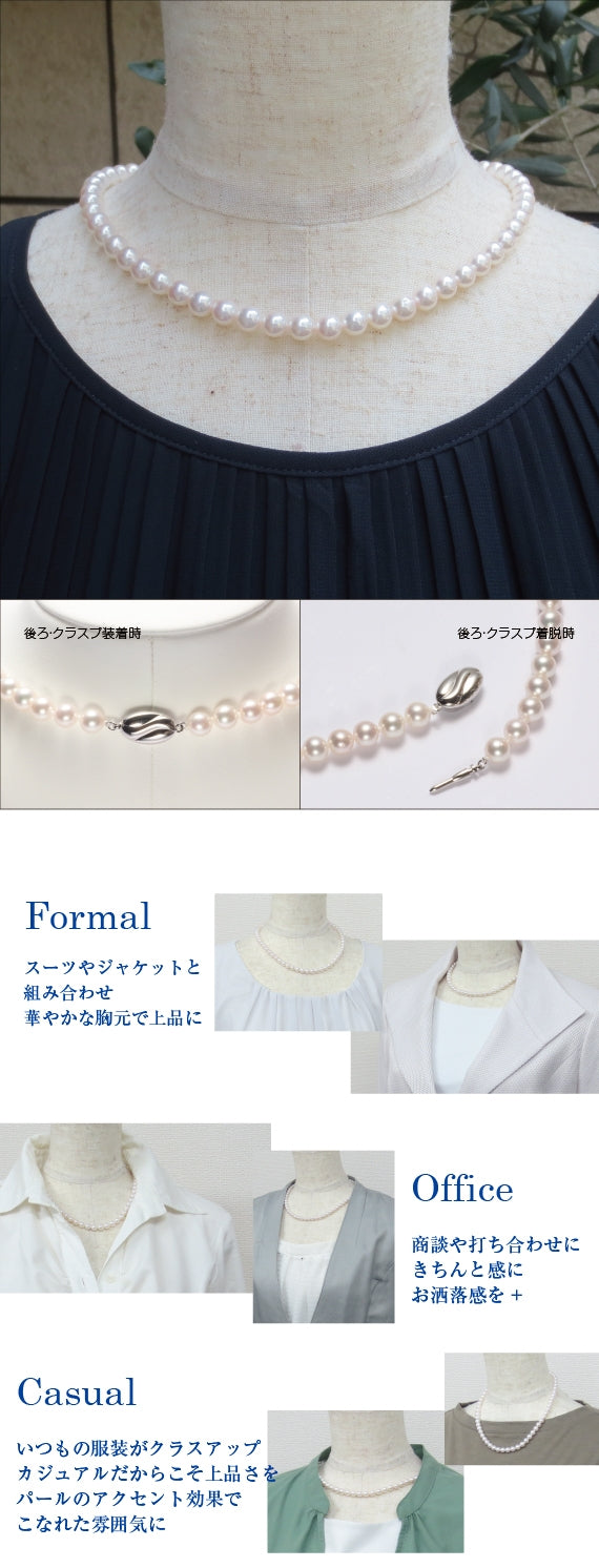 最も人気の定番7.5mm。サイズに迷ったらこのサイズを!優しく上品なホワイトカラーの輝きが胸元を彩ります。