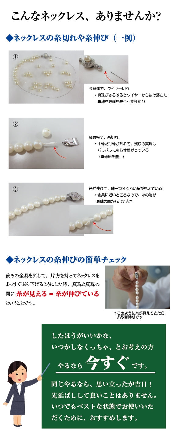 真珠ネックレスは使用を繰り返し、経年により摩耗劣化し、切れやすくなります。