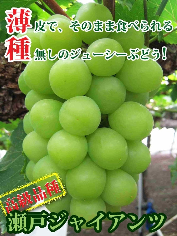 晴れの国おかやまの新しい味です。瀬戸ジャイアンツは、20年余りの歳月をかけて生み出された岡山の新しい葡萄です。果皮がうすいので、そのまま粒ごと食べて、しかも種なし、ハウスで栽培しており、一房一房たんねんに創りあげた自信の作です。岡山の新しい味を、お試し下さい。