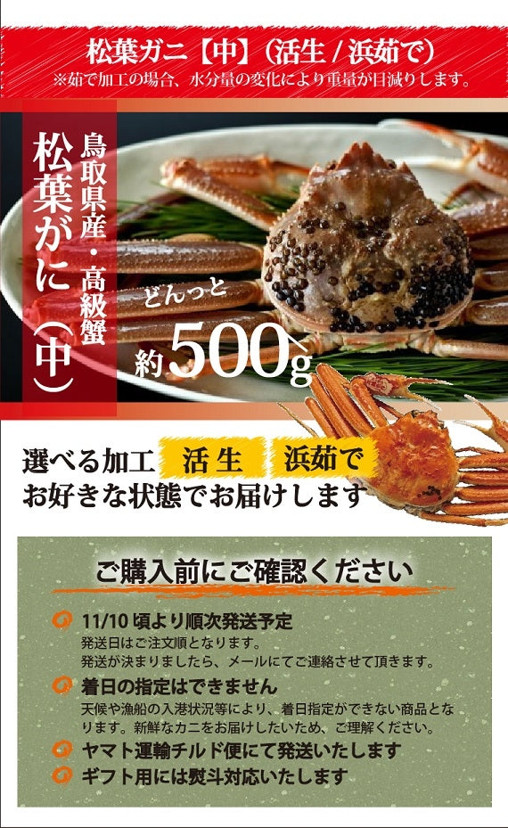 ブランドタグ付・松葉ガニ 中サイズ(500g前後)×1枚 【生】 ※活生、茹でお好きな状態でお届けします。