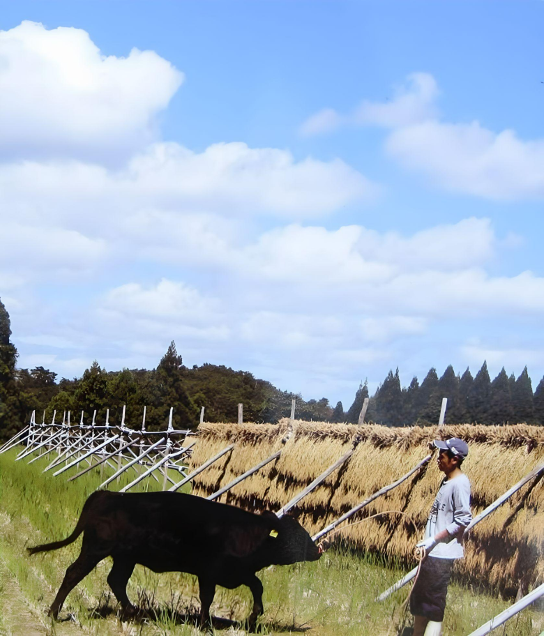 昔ながらの自然の循環による栽培で手間ひま掛けたお米です。和牛の繁殖とお米作り。田んぼの周りにはこいのぼりが泳ぎ、案山子が成長を見守ります。20日間のハデ干し(天日干し)乾燥で、旨さ倍増。安全で美味しいお米作りに取り組んでいます。