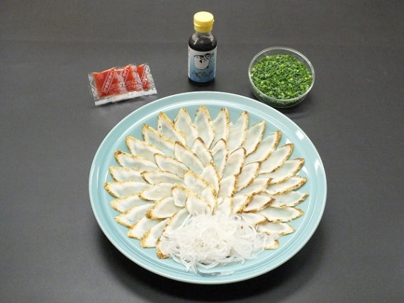 真ふくタタキ刺身・解凍(トラフク皮刺し含む)130g、ぽん酢95ml、もみじおろし5g×3、きざみねぎ