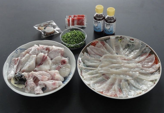 トラフクしゃぶ薄造り身 160g、ちり(切り身アラ身)450g、トラフク焼きひれ5枚、ポン酢95ml×2、もみじおろし5g×6、きざみねぎ10g