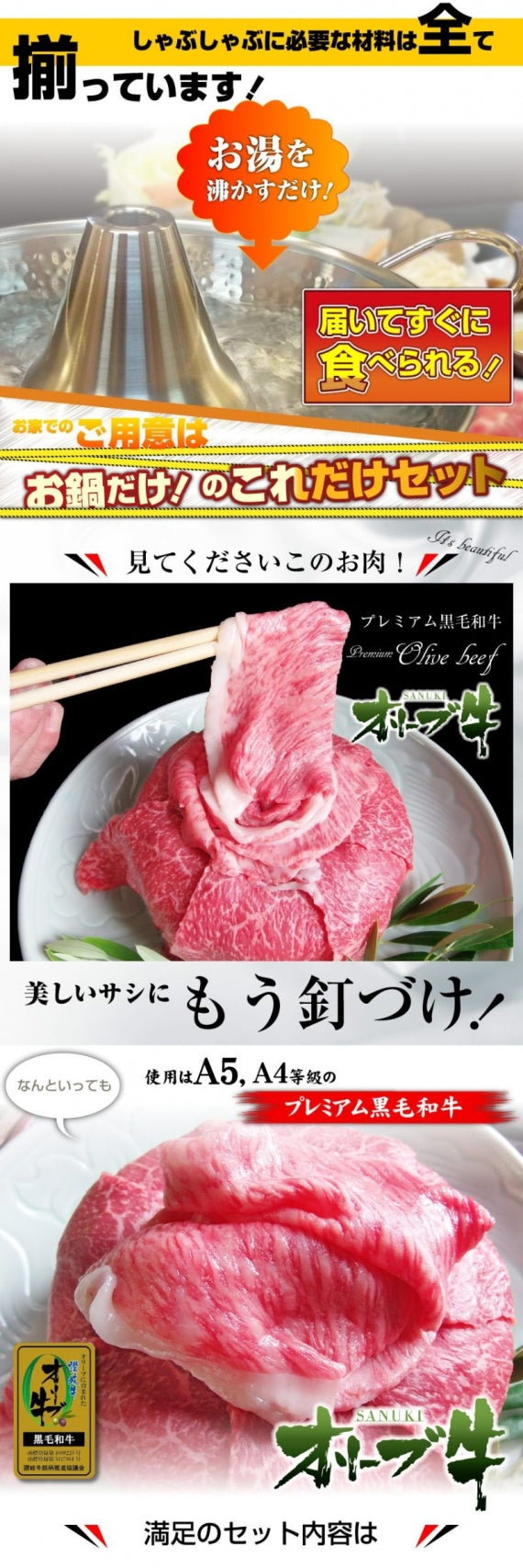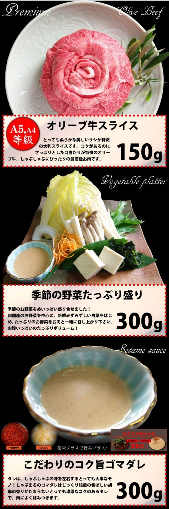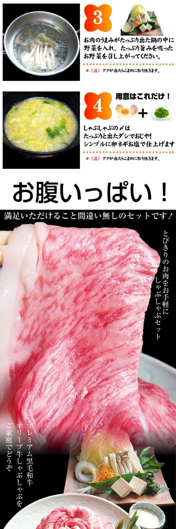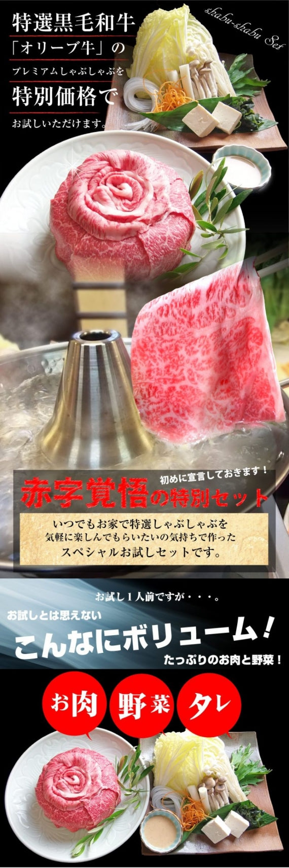 牛肉 肉 お試し オリーブ牛 しゃぶしゃぶ 1人前 野菜付き セット 鍋セット 特選 冷蔵便 特選牛 黒毛和牛 お歳暮 ギフト 食品 プレゼント お祝い