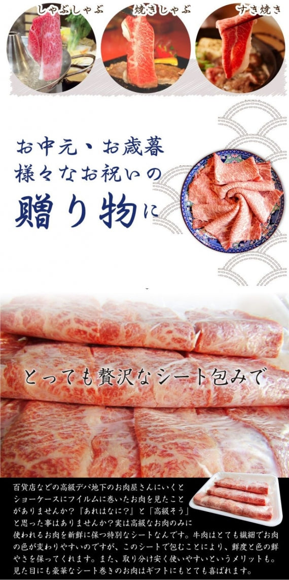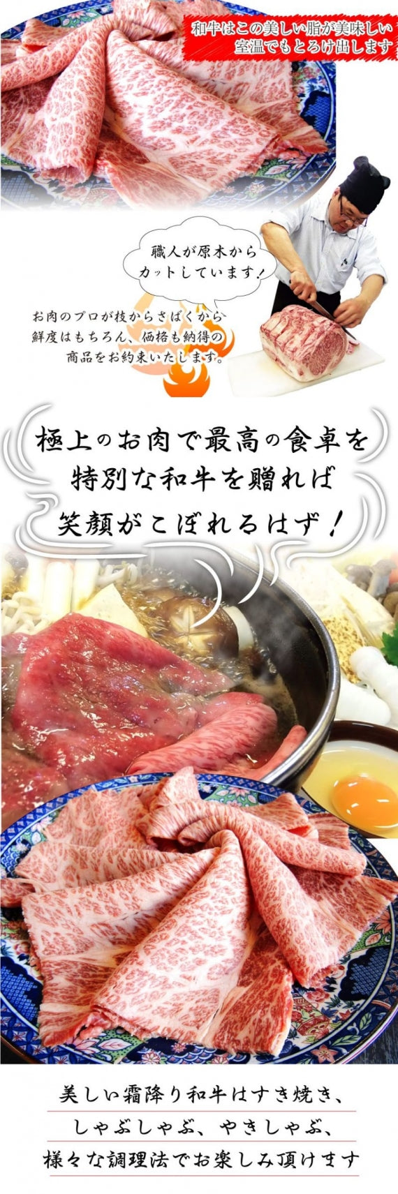 内容量400g産地名日本保存方法-18℃以下で保存 賞味期限製造日より45日以内。ナマモノなのでお早めにお召し上がりください。商品特徴すき焼き、しゃぶしゃぶにピッタリな見事な霜降り黒毛和牛。お中元、お歳暮などに最適。販売事業者名 : (有)しゃぶ亭まる 販売事業者住所:761-0313香川県高松市下田井町594-2冷凍商品との同梱可。 複数購入の場合は1梱包でまとめてお送りさせていただきます。別々にギフト梱包をご希望の場合は備考欄にお書き添えくださいますようお願い申し上げます。