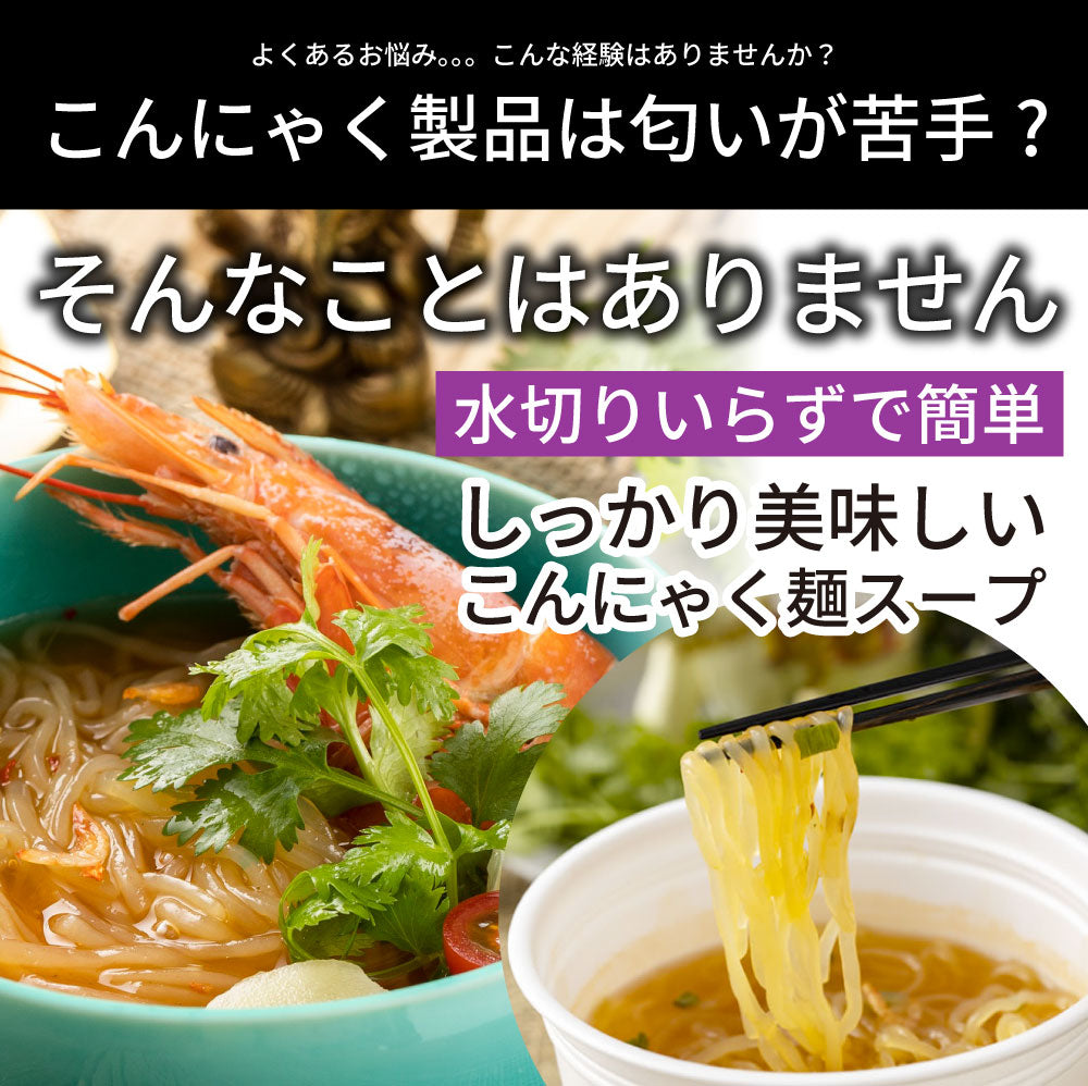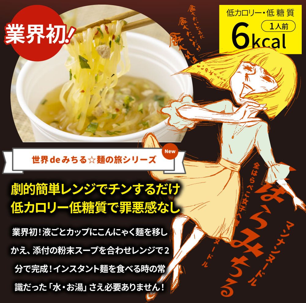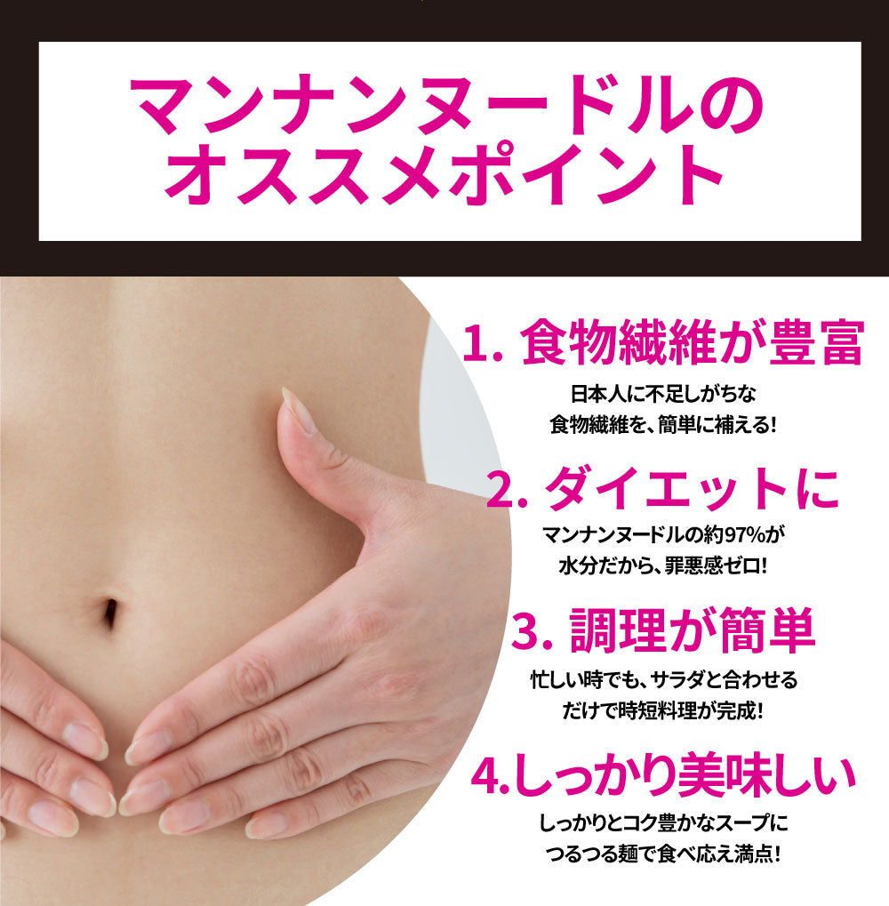 | 原材料 | マンナンヌードル・スープ[こんにゃく精粉(国産),食塩/水酸化カルシウム(蒟蒻用凝固剤),調味料(核酸等),酸化防止剤(V.C),結晶セルロース,カロチン色素] 粉末スープ[食塩(国内製造),砂糖、乾燥食肉加工品(鶏肉,大豆たん白,乾燥卵白,デキストリン,チキンオイル,その他),乾燥ねぎ,粉末しょうゆ,こしょう,チキンエキスパウダー,ジンジャー粉末,スターニアス末,唐辛子/調味料(アミノ酸等),酸味料,カラメル,セルロース,加工デンプン,乳化剤,酸化防止剤(ローズマリー抽出物),香辛料抽出物,(一部に小麦・卵・乳成分・大豆・鶏肉を含む)] |