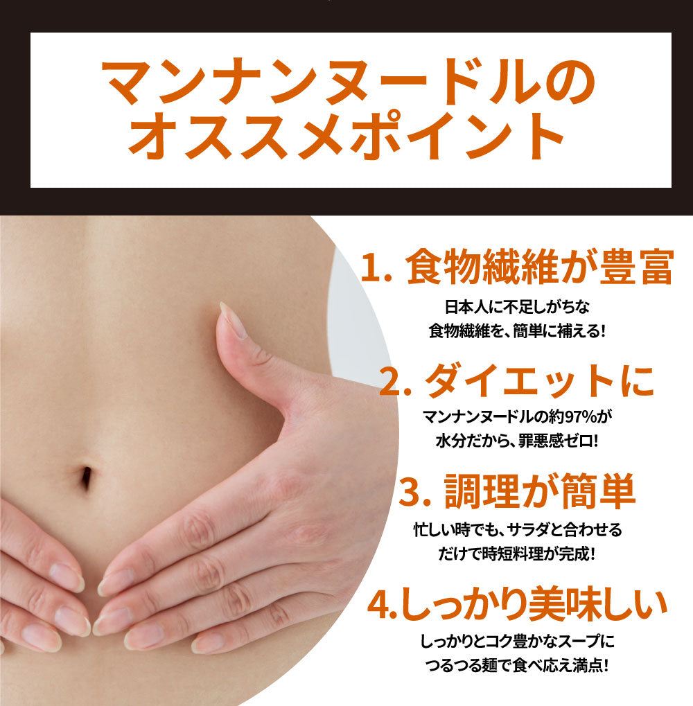 | 原材料 | マンナンヌードル・スープ[こんにゃく精粉(国産),食塩/水酸化カルシウム(蒟蒻用凝固剤),調味料(核酸等),酸化防止剤(V.C),結晶セルロース,カロチン色素] 粉末スープ[食塩(国内製造),クリーミングパウダー(デキストリン,植物油脂,乳糖,脱脂粉乳),砂糖,乾燥食肉加工品(鶏肉,大豆たん白,乾燥卵白,デキストリン,チキンオイル,その他),でん粉,乾燥ねぎ,ガーリック粉末,こしょう,いりごま,たん白加水分解物,チキンエキスパウダー,ビーフエキスパウダー,オニオン粉末,植物油脂/調味料(アミノ酸等),酸味料,セルロース,カゼインNa,リン酸K,乳化剤,加工でん粉,カラメル色素,酸化防止剤(ローズマリー抽出物),香辛料抽出物,(一部に小麦・卵・乳成分・牛肉・ごま・大豆・鶏肉・豚肉・ゼラチンを含む)] |