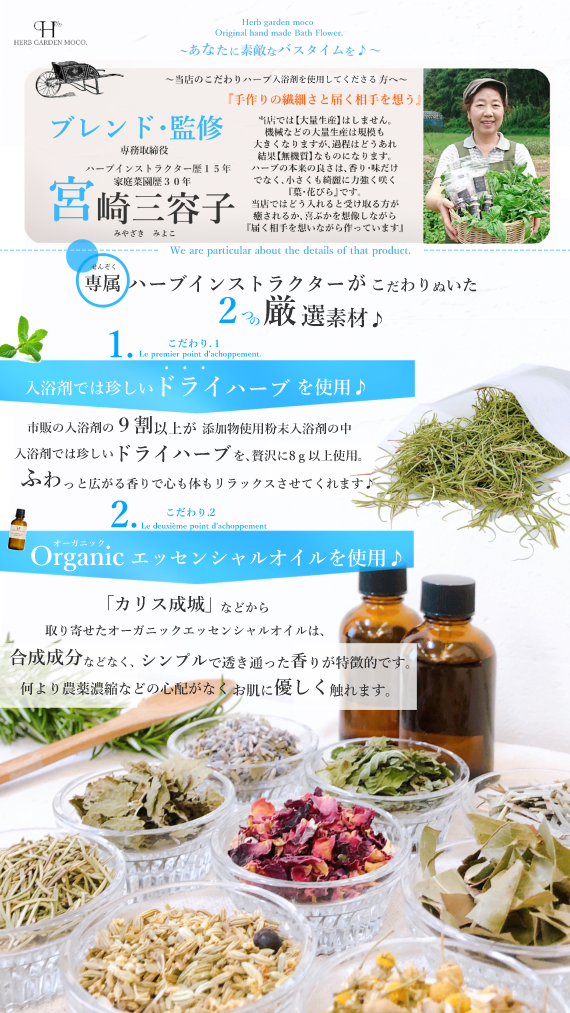 ハーブは、私たちの心にゆとりを、からだに元気を、そして暮らしにうるおいを与えてくれます。■魅力いっぱいのハーブティーは、香りの効果と飲むことで、心とからだにやさしく働きかけます。手軽に、美味しいハーブティーを楽しんで下さいね。■また、お風呂も楽しみのひとつですね。自然の香りのハーブ入浴剤で、優雅なひとときを!新鮮なハーブを煮込んで作った手作り石けんで、やさしくからだを洗って下さいね。■ハーブガーデンmocoは、これからもみなさまに愛される商品を作り続けていきます。