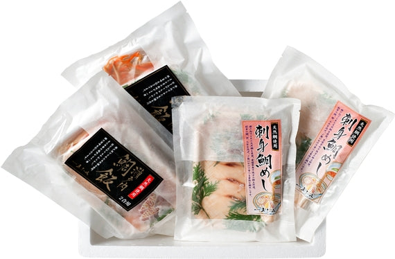 鯛飯2合用×2(2合用:鯛切身8切120g、牛蒡20g、人参20g、だし360ml)、刺身鯛飯×2(1パック:天然鯛スライス36g×2、たれ25g×2)