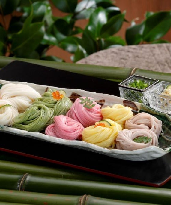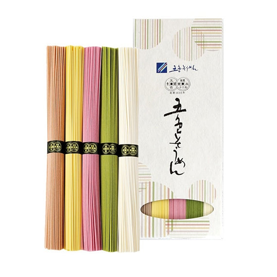 厳選した小麦の白麺、抹茶・梅・蜜柑・もち麦の自然素材と天然色素を練り込んだ色麺を、それぞれひと束ずつ収めました。本来は混ぜ麺である五色そうめん定番の5色を色別に味わっていただけます。白・緑・赤・黄・茶の彩り、素材ごとの風味、手延ならではのなめらかな食感をお楽しみください。化粧箱入り250g