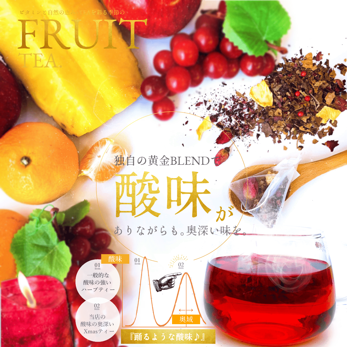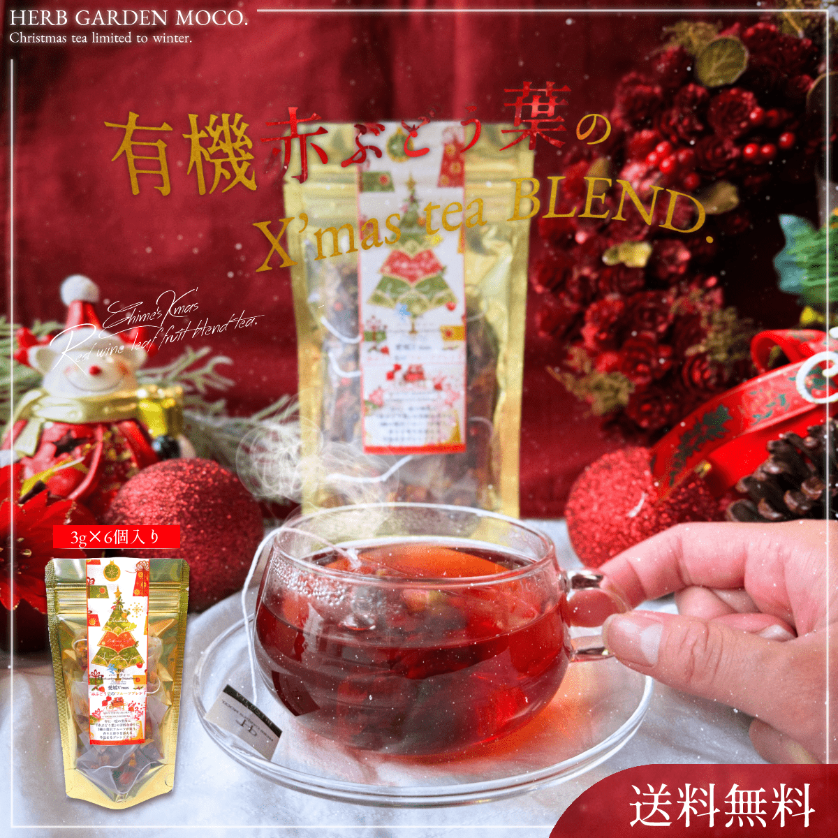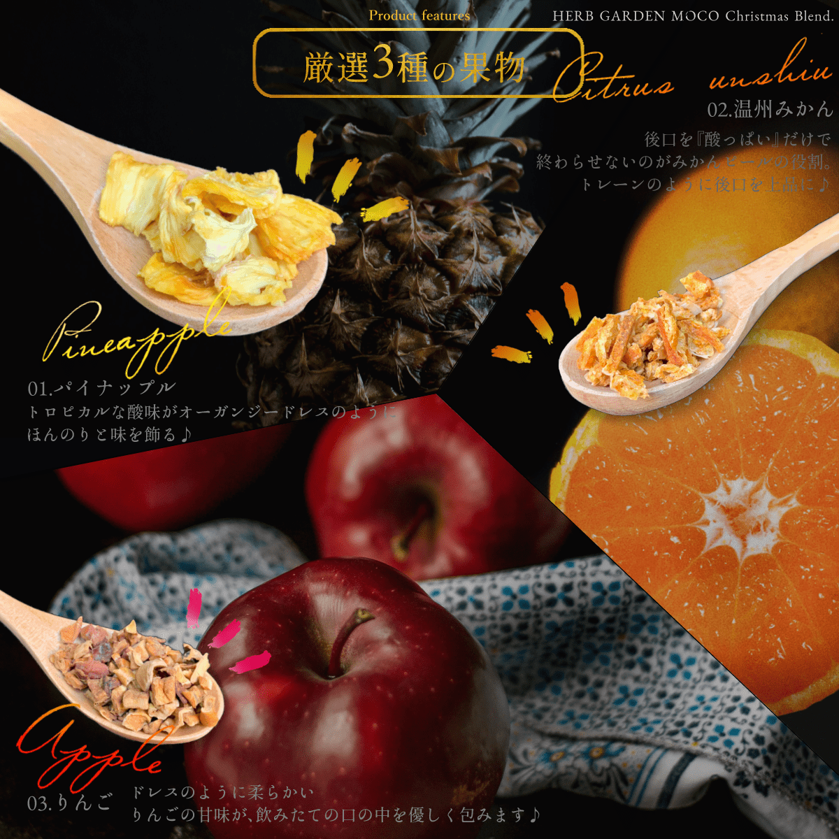 赤ぶどう葉、ハイビスカス、りんごみかんチップ、パイナップルローズレッドバッズ、ピンクペッパー