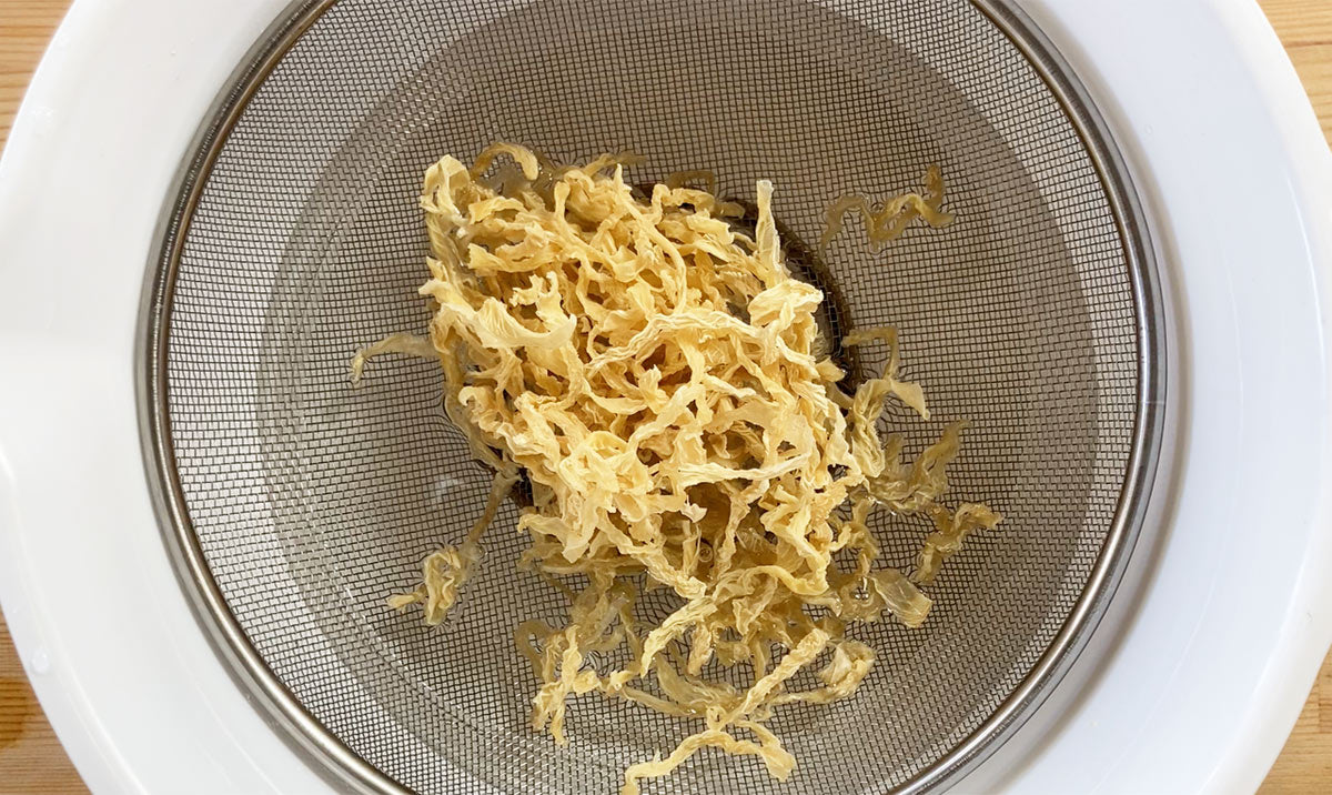 ゆで干し大根はザルに入れて水で軽く洗い、水から上げ、水気を絞らず10分程おいて料理にお使いください。