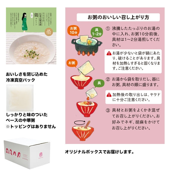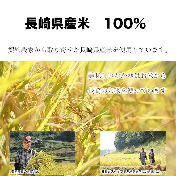 【粥】だし(鶏肉、ネギ、生姜、イカ)、米(長崎県産)、ごま油、食塩、チキンエキス、デキストリン、ぶどう糖、調味料(アミノ酸等) (原材料の一部に大豆を含む)