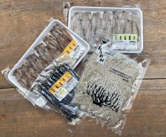 ・メヒカリ塩開き=宮崎県産メヒカリ,食塩,トレハロース,梅干し粉末,昆布粉末昆布粉末・メヒカリみりん=宮崎県産メヒカリ,本醸造醤油(大豆・小麦),鹿児島県産砂糖,みりん,魚醤,トレハロース・日向丸干し=うるめイワシ,食塩,梅干し粉末,昆布粉末 ・ちりめん=宮崎産いわし子,食塩※ちりめんにエビやカニが含まれる場合があります