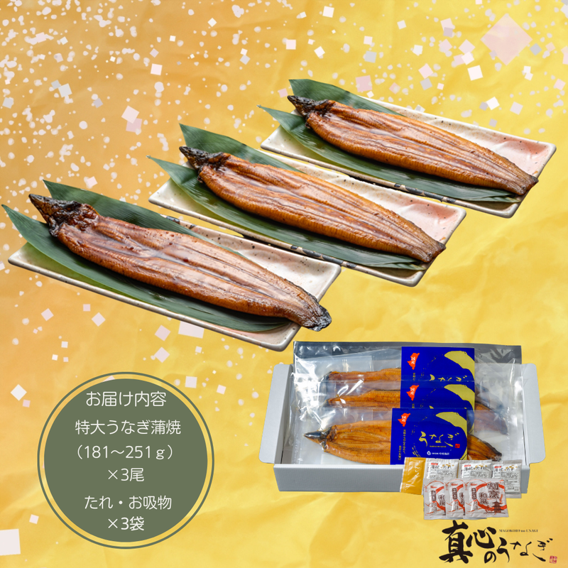 特大サイズうなぎ蒲焼(181~215g)×3, 添付タレ×3, 山椒×3, お吸い物×3