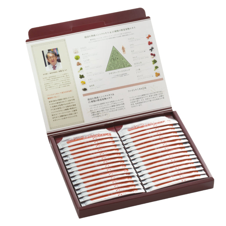 深海1万メートル相当の100MPaからさらに高い600MPaの超高圧で加工する技術で、余分な熱を加えずに、熟成、殺菌、エキス化させることなどが可能になります。この商品は、超高圧製法で作られた野菜エキス・にんにくエキスを配合しています。野菜や果物を独自の超高圧製法で酵素分解することで細胞壁を壊して多くのファイトケミカルが引き出され、効率よく摂取いただけます。