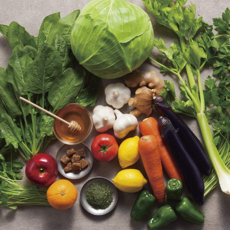野菜エキス(リンゴ、オレンジ、レモン、キャベツ、ニンジン、ホウレンソウ、ショウガ、ピーマン、ナス、トマト、セロリ、緑茶葉)(国内製造)、黒糖、ニンニクエキス(ニンニク、三つ葉、レモン)、蜂蜜、リンゴ果汁/酸味料、増粘剤(キサンタンガム)、香料ビタミンB1、ビタミンB6、ビタミンB2
