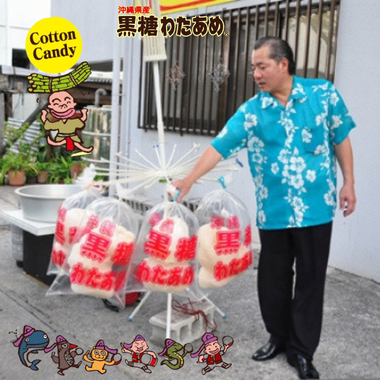 第29回沖縄産業まつり「県知事賞」「優秀賞」受賞!第57回全国観光土産品「特別審査優秀賞」受賞!沖縄県産の純黒糖たっぷり使ったわたあめ。特許技術により黒糖わたあめを20分の1に圧縮し、ふわふわの品質を保ったままパッケージ化!半年間も黒糖わたあめ自体の風味と口溶け柔らかなふわふわ感をそのままにお届けします。ご家庭でもお土産としても喜ばれます。沖縄のさとうきびを使ってつくった甘さがさっぱりしたとてもおいしい綿あめです。製法特許商品です。