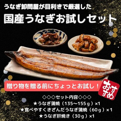 蒲焼中サイズ(135~155g)×1尾,きざみ(60g)×1袋,肝焼き(30g)×1袋, 添付タレ×2, 山椒×2, お吸い物×2