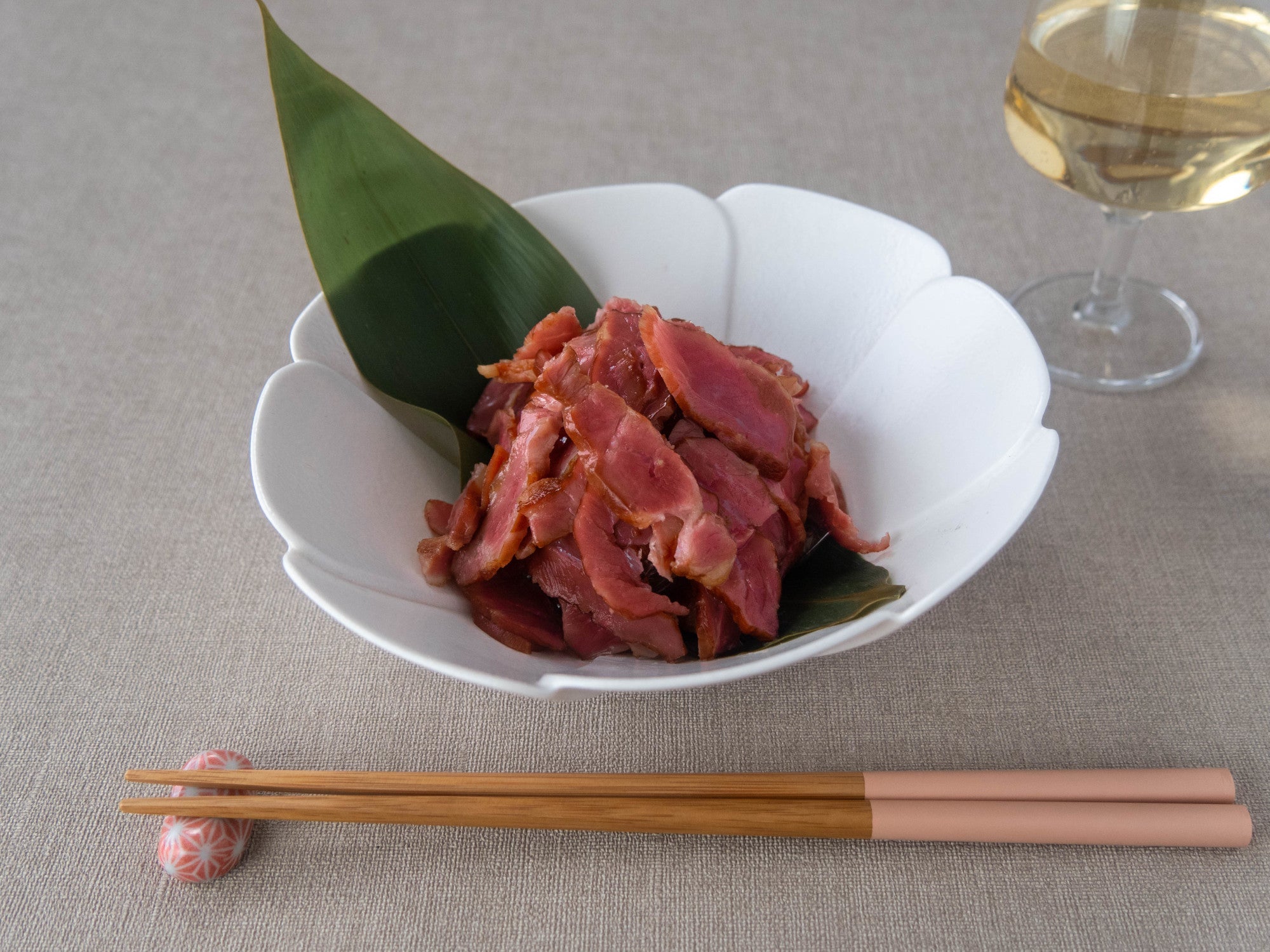 コワダヤ、自社農場及び契約農場の鹿児島産黒豚コメカミ肉を使用。弾力がありながら柔らかく、ジューシーなおいしさを持った希少部を国産サクラのスモークチップでスモークした一品です。80gの少量タイプで酒の肴にピッタリです。