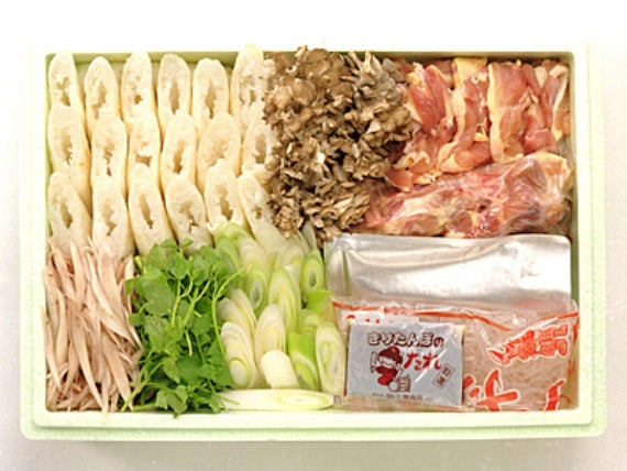 きりたんぽ12本、比内地鶏300g、鶏がら1ヶ、濃縮たれ300cc1ヶ・濃縮たれ46cc1ヶ、糸こんにゃく1ヶ、ねぎ290g、ごぼう100g、まいたけ130g、せり110g