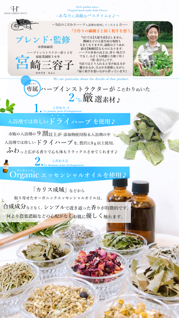 ハーブは、私たちの心にゆとりを、からだに元気を、そして暮らしにうるおいを与えてくれます。■魅力いっぱいのハーブティーは、香りの効果と飲むことで、心とからだにやさしく働きかけます。手軽に、美味しいハーブティーを楽しんで下さいね。■また、お風呂も楽しみのひとつですね。自然の香りのハーブ入浴剤で、優雅なひとときを!新鮮なハーブを煮込んで作った手作り石けんで、やさしくからだを洗って下さいね。■ハーブガーデンmocoは、これからもみなさまに愛される商品を作り続けていきます。