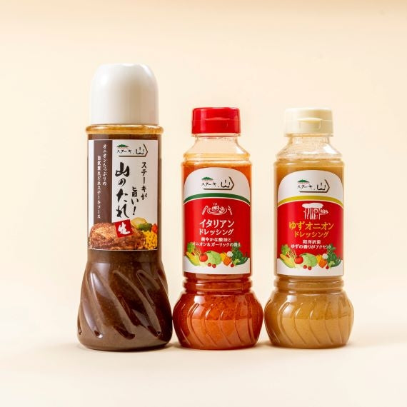 山のたれ400ml×1、イタリアンドレッシング280ml×1、ゆずオニオンドレッシング280ml×1