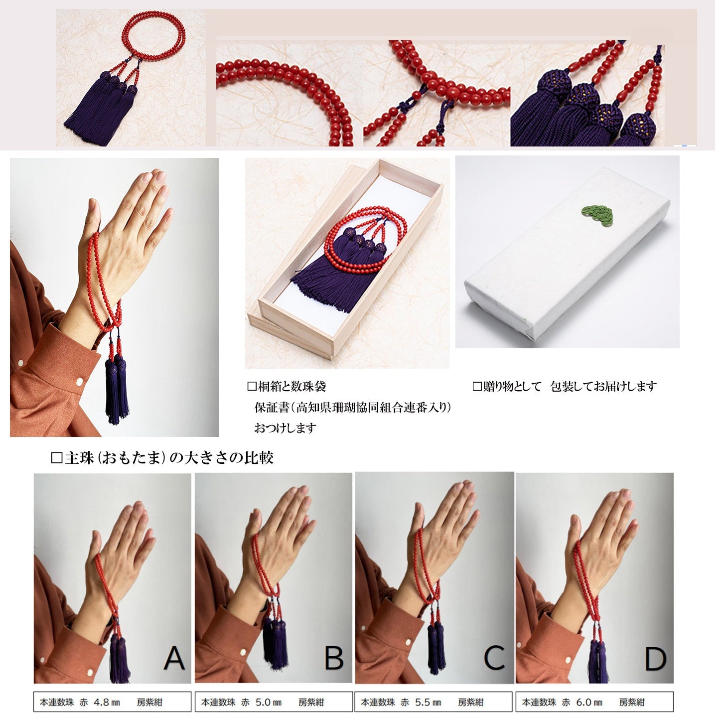 赤サンゴ本連数珠1本 数珠袋1個 桐箱1個 保証書(高知県珊瑚協同組合)
