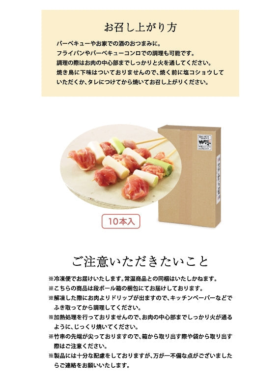 ※こちらの商品は、他の焼き鳥10本入りの商品4つと同梱できます。1箱に10本入りを5つまで同梱可能です。(ねぎま、もも、かわ、せせりのいずれか鶏肉のみ)ご注文の際、備考欄に「同梱希望」とご記入ください。
