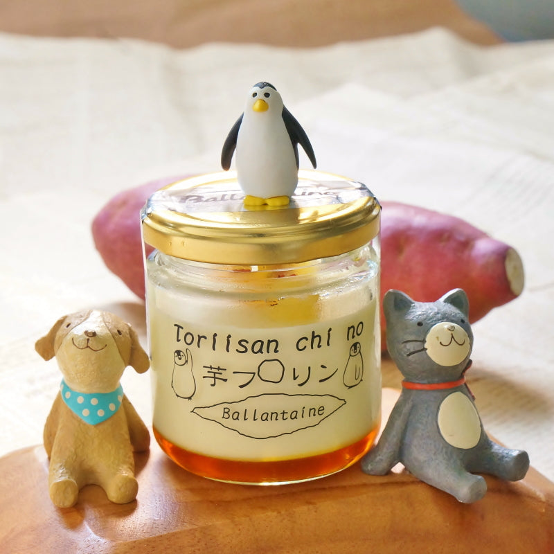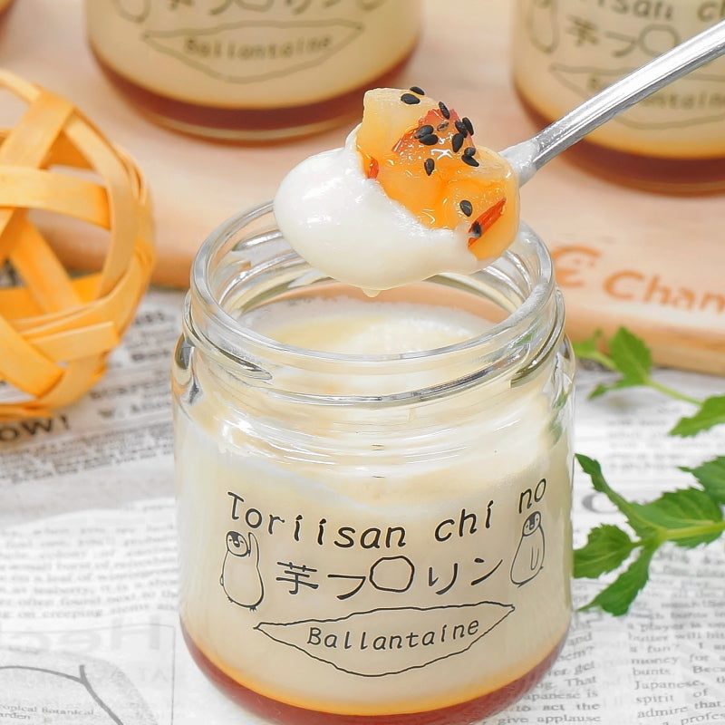 生クリーム、牛乳、サツマイモ、卵、グラニュー糖、ゼラチン、サツマイモの甘露煮、ゴマ、水飴、寒天. ゲル化剤(増粘多糖類、ペクチン)、乳化剤、 香料酸味料、保存料(ソルビン酸)、酸化防止剤(VC)