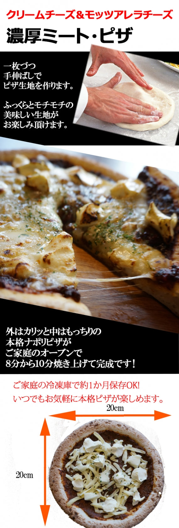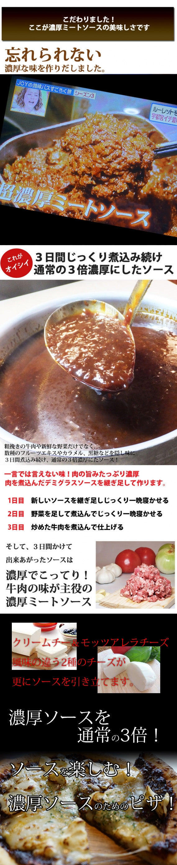 【生地】小麦粉、ぶどう糖、食塩、植物性油脂、イースト、モルトエキス、【ミートソース】牛肉、ホールトマト、デミグラスソース、エダムチーズ、玉葱、バター、黒砂糖、マッシュルーム、にんじん、グラニュー糖、トマトペースト、赤ワイン、チャツネ、オリーブオイル、フォンドボー、大豆油、塩、小麦粉、コショウ【具材】ナチュラルチーズ、モッツァレラチーズ、クリームチーズ