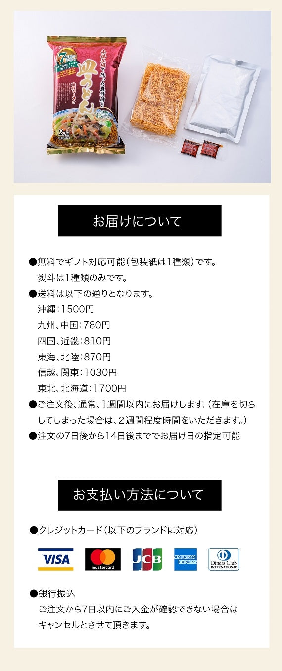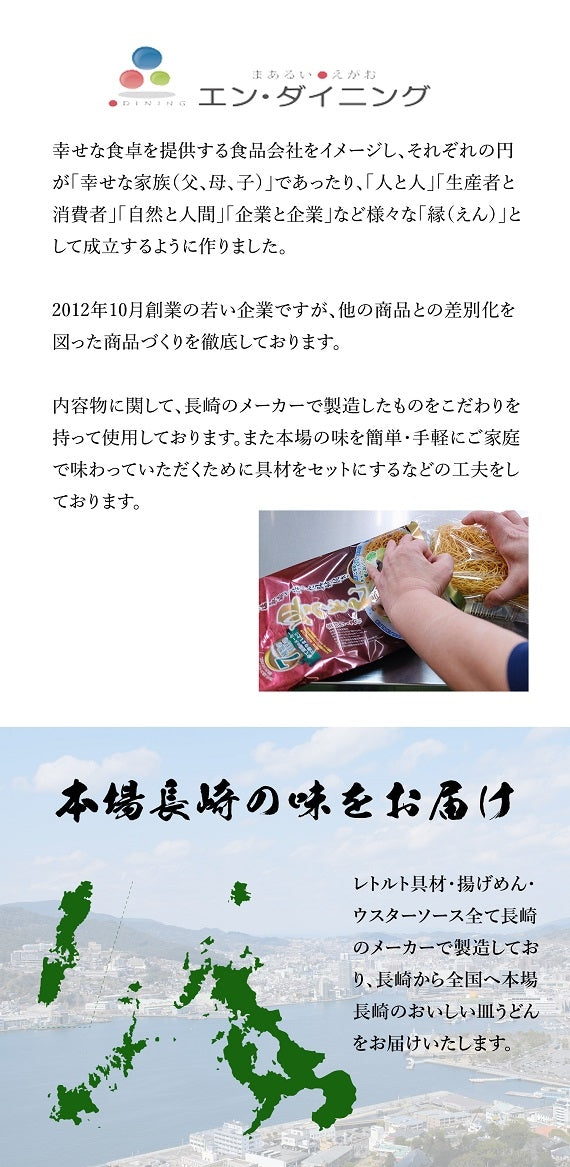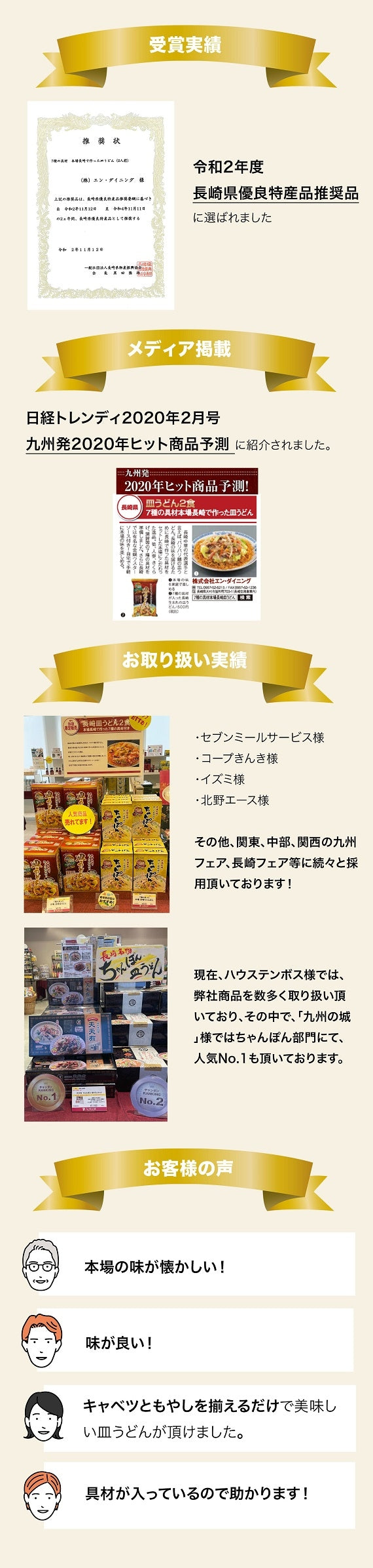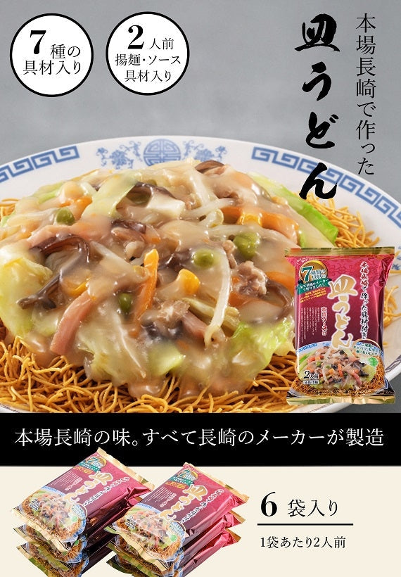 ①ご用意頂いたキャベツを一口大に切ってください。②よく熱したフライパンに、食用油大さじ1杯を入れキャベツを入れ、少し炒めてからもやしを入れ炒めてください。③②のフライパンに添付の具材を入れて、一煮立ちさせてください。④皿に盛った揚げめんの上に出来上がった③の具材をかけて出来上がりです。最初はそのままで、半分はソースをかけて、1度で2度おいしい皿うどんの食べ方を是非お試しください。