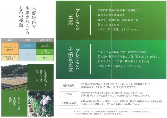 京都府内産の一番茶葉のみを使用し、生産履歴を証明できる等の要件に加えて、品質審査会で一定水準を満たすものを「プレミアム玉露」、さらに手摘み100%のものを「プレミアム手摘み玉露」として認証されます。