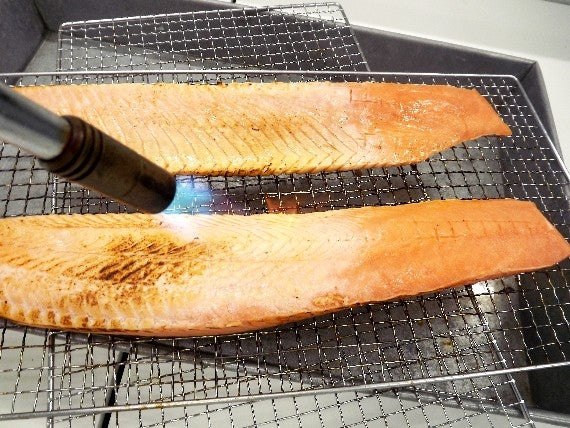 「炙り焼き」では高温ガスバーナーで「表面の余分な水分」を飛ばします。