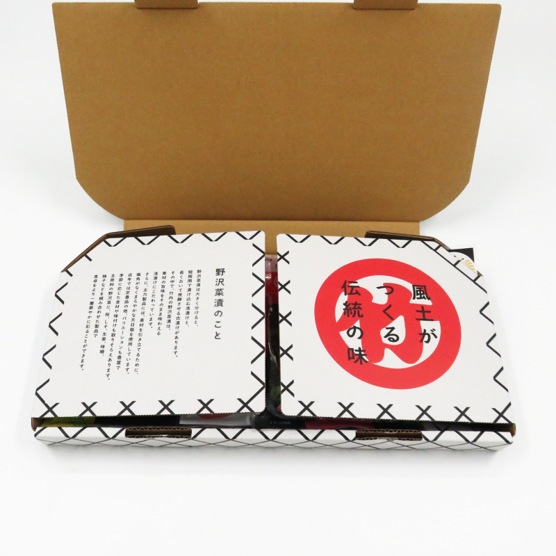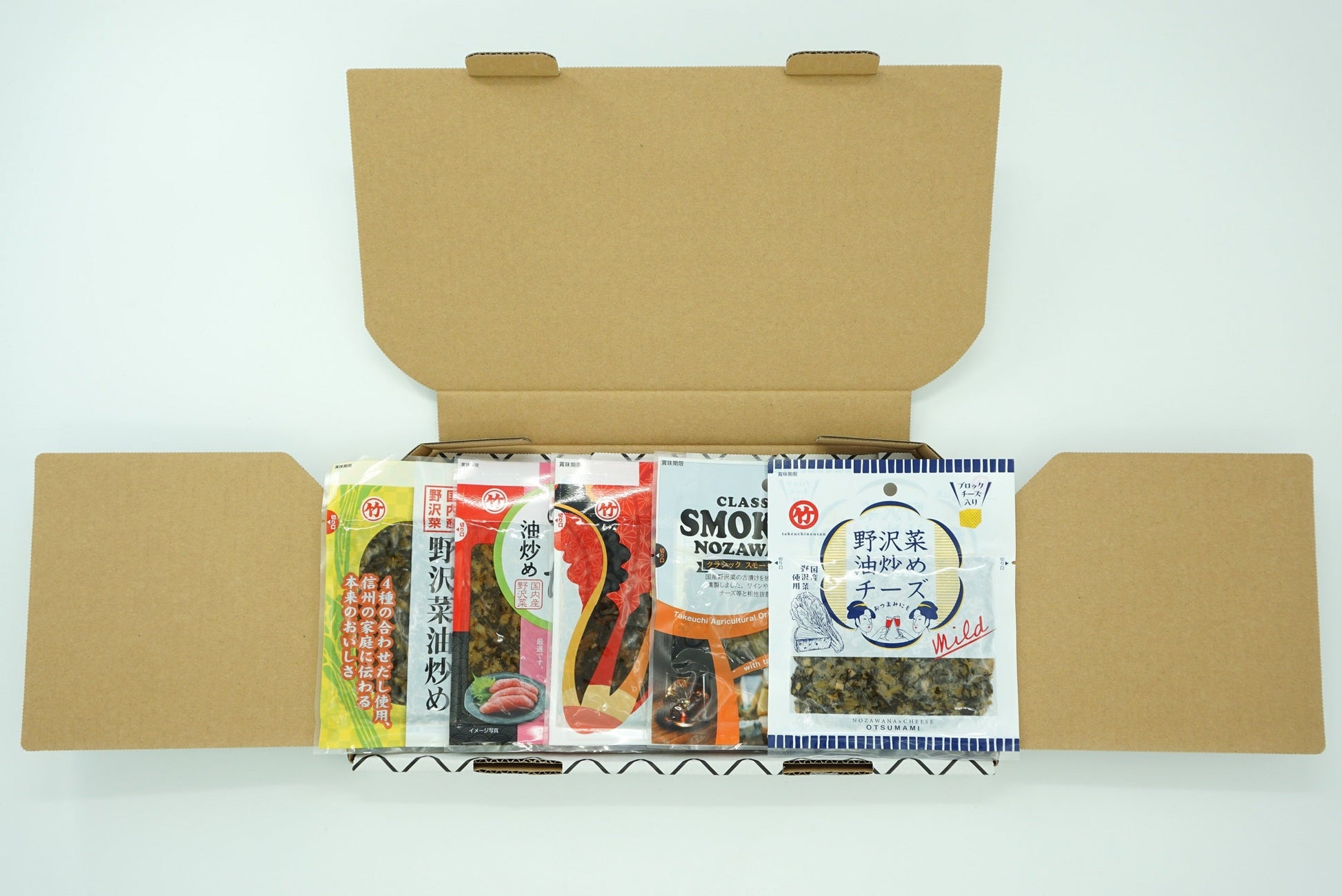 ①化学調味料不使用 野沢菜油炒め(100g、②旨辛野沢菜 100g、③野沢菜 めんたい油炒め 80g、④野沢菜油炒めチーズ50g ⑤クラシックスモーク野沢菜 50g