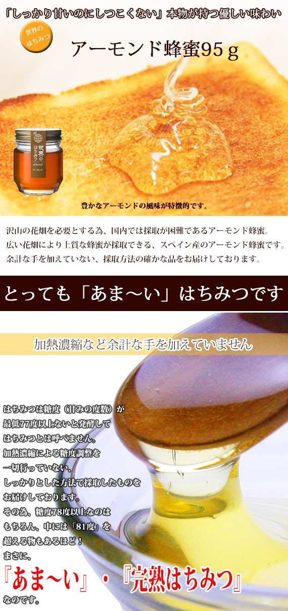 天然100%・・・あたりまえのハチミツをお届けします。大場養蜂園では、日本で採取が困難な珍しい天然はちみつをご紹介、お届けしております。無添加、無精製、非加熱濃縮のハチミツは、花の香りあふれる、奥深い味わいとすっきりとした後味です。ミツバチたちが運んでくれた「自然からの恵み」をご賞味ください。