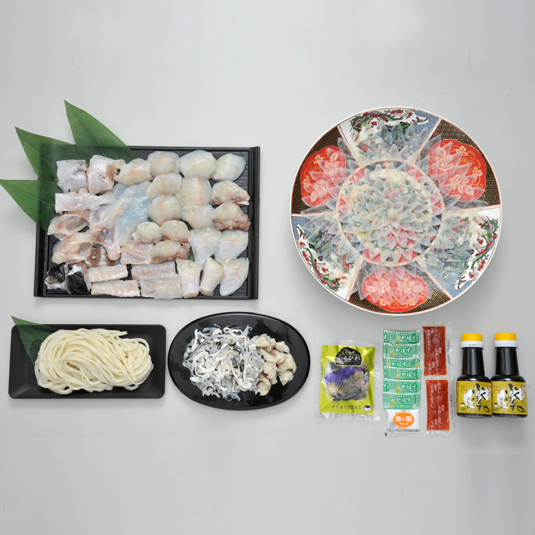 ◆天然とらふく刺身180g(33cm陶器皿)◆とらふく皮180g◆ふくちり750g(アラ:トラフグ・身:マフグ各375g)◆とらふく入りうどん250g◆とらふくひれ酒用ヒレ5枚◆ポン酢◆モミジオロシ◆塩◆カボス果汁