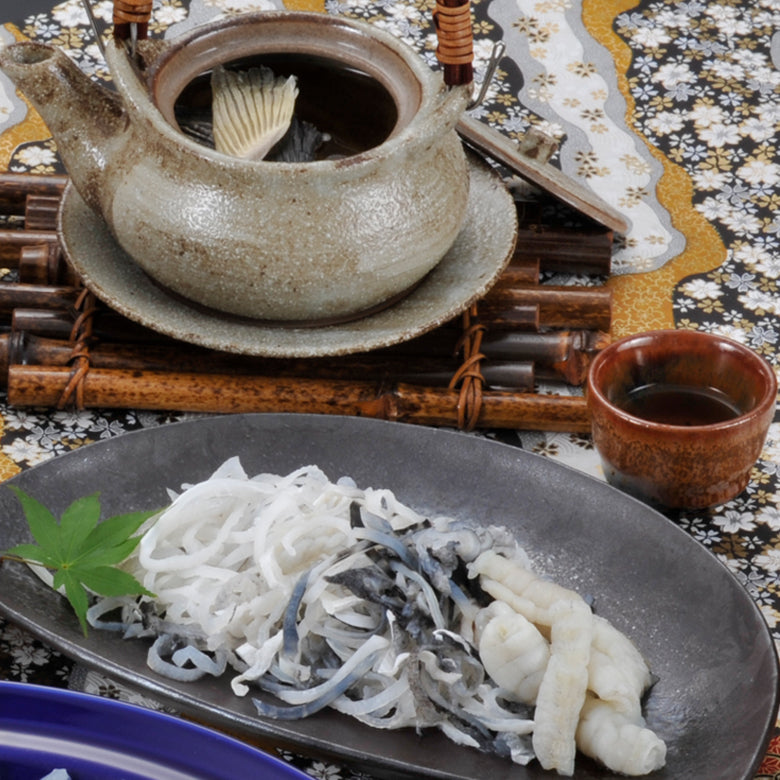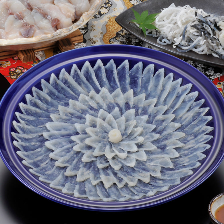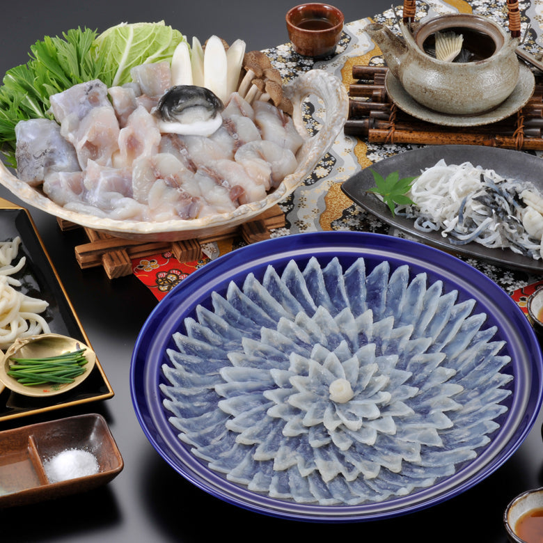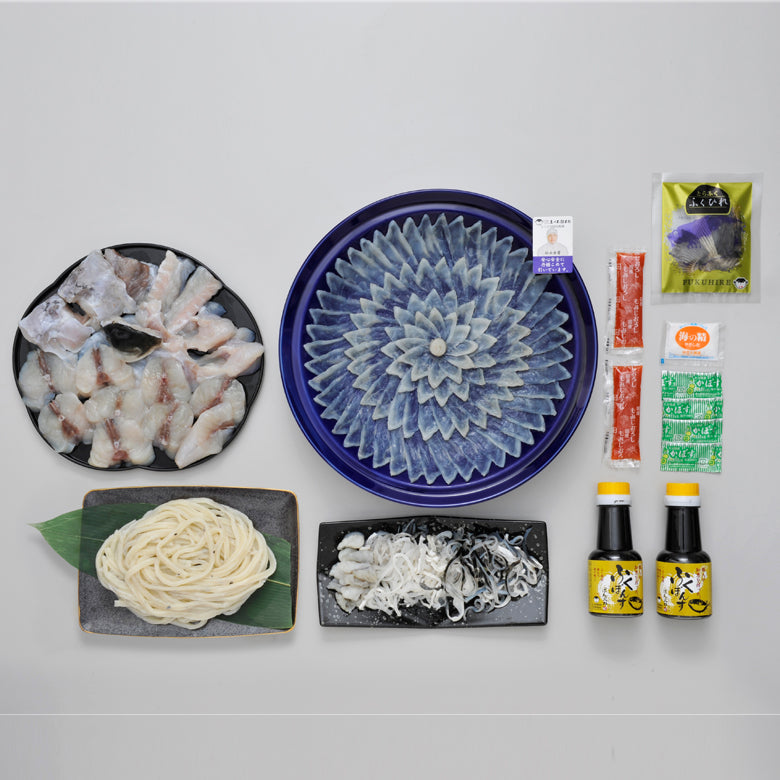◆天然とらふく刺身120g(30cm陶器皿)◆とらふく皮120g◆ふくちり500g(アラ:トラフグ・身:マフグ各250g)◆とらふく入りうどん250g◆とらふくひれ酒用ヒレ5枚◆ポン酢◆モミジオロシ◆塩◆カボス果汁