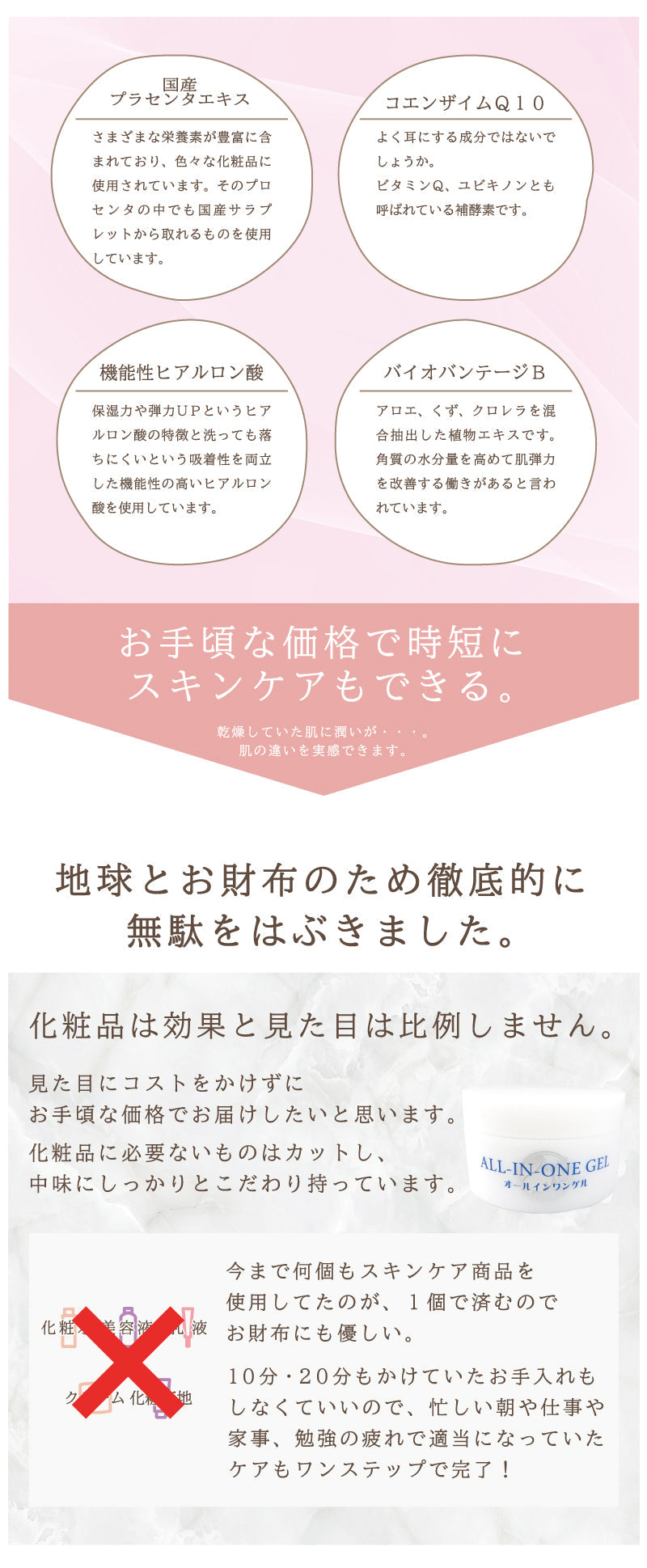 全成分(道奥美女 オールインワンゲル)水、グリセリン、スクワラン、ペンチレングリコール、BG、ヒバ油、馬油、水溶性プロテオグリカン、プラセンタエキス、ユビキノン、リンゴ果実エキス、白金、アロエベラ葉エキス、クズ根エキス、クロレラエキス、ヒアルロン酸ヒドロキシプロピルトリモニウム、DPG、エタノール、カルボマー、リゾレシチン、ポリソルベート80、水酸化K、トコフェロール、フェノキシエタノール