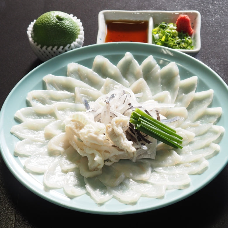 とらふぐ刺身130g、とらふぐ皮・身皮60g、とらふぐ焼ひれ4g、刺身用かぼすポン酢150ml、もみじおろし、ねぎ、かぼす2玉