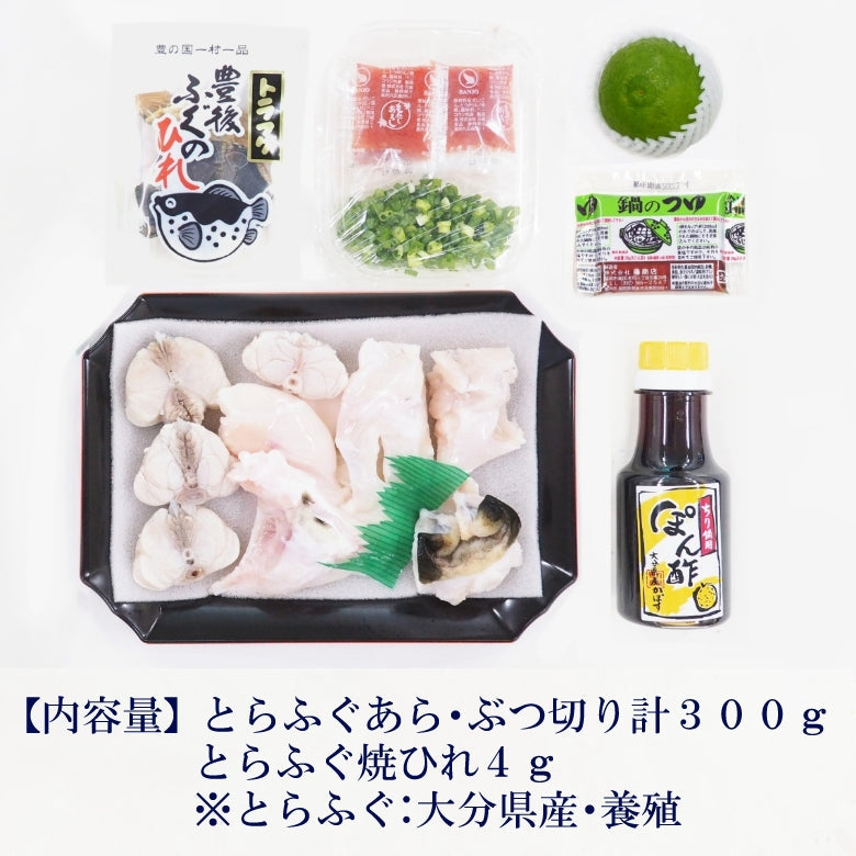 とらふぐあら・ぶつ切り計300g、とらふぐ焼ひれ4g、かぼすポン酢150ml、もみじおろし、ねぎ、かぼす1玉