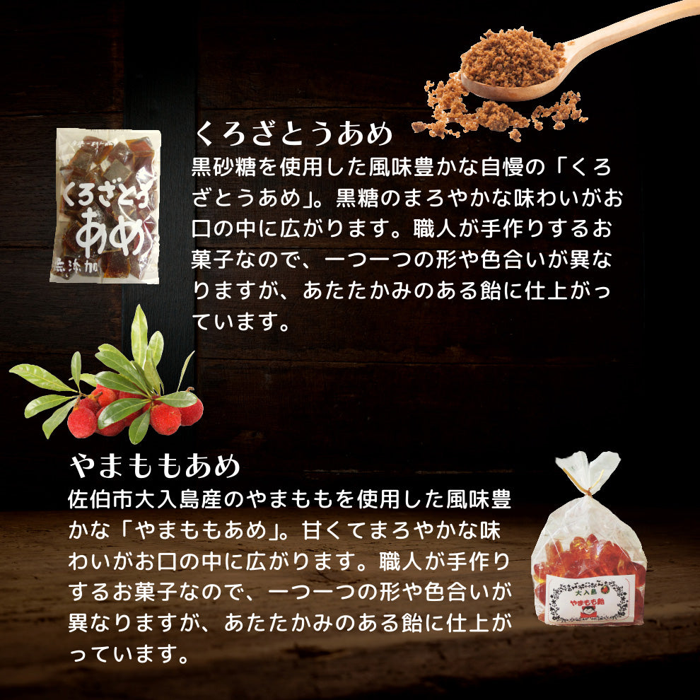 【カボスあめ】 砂糖(国内製造)、水飴、果汁/香料 【やまもも飴】 砂糖(国内製造)、水飴、やまもも果汁(大入島産)/香料 【はちみつあめ】 砂糖(国内製造)、水飴、はちみつ 【いちごあめ】 砂糖(国内製造)、水飴、果汁/香料 【くろざとうあめ】 砂糖(国内製造)、水飴、黒砂糖